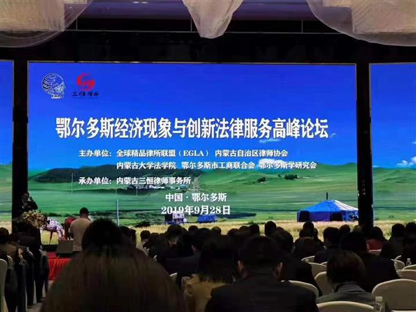 9月28日,由全球精品律所联盟(EGLA)、内蒙古自治区律师协会、内蒙古大学法学院、鄂尔多斯市工商业联合会、鄂尔多斯学研究会主办,内蒙古三恒律师事务所承办的鄂尔多斯经济现象与创新法律服务高峰论坛在雍贵酒店成功举办。来自全球精品律所联盟(EGLA)战略委员会主席、副主席,EGLA执委主席、副主席,82家联盟成员律所的主任、合伙人、律师和鄂尔多斯各界嘉宾参加论坛。